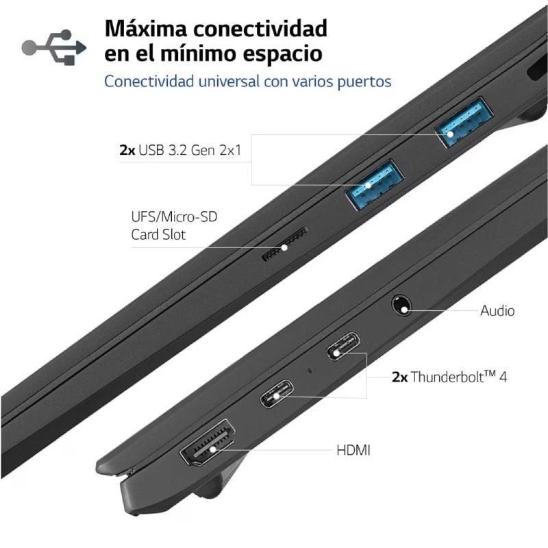 LG gram ofrece no solo varios puertos sino también dos Thunderbolt™| 4 para la máxima escalabilidad. Experimenta la pantalla 5K con 40GB de velocidad de transferencia mientras cargas dispositivos externos simultáneamente.